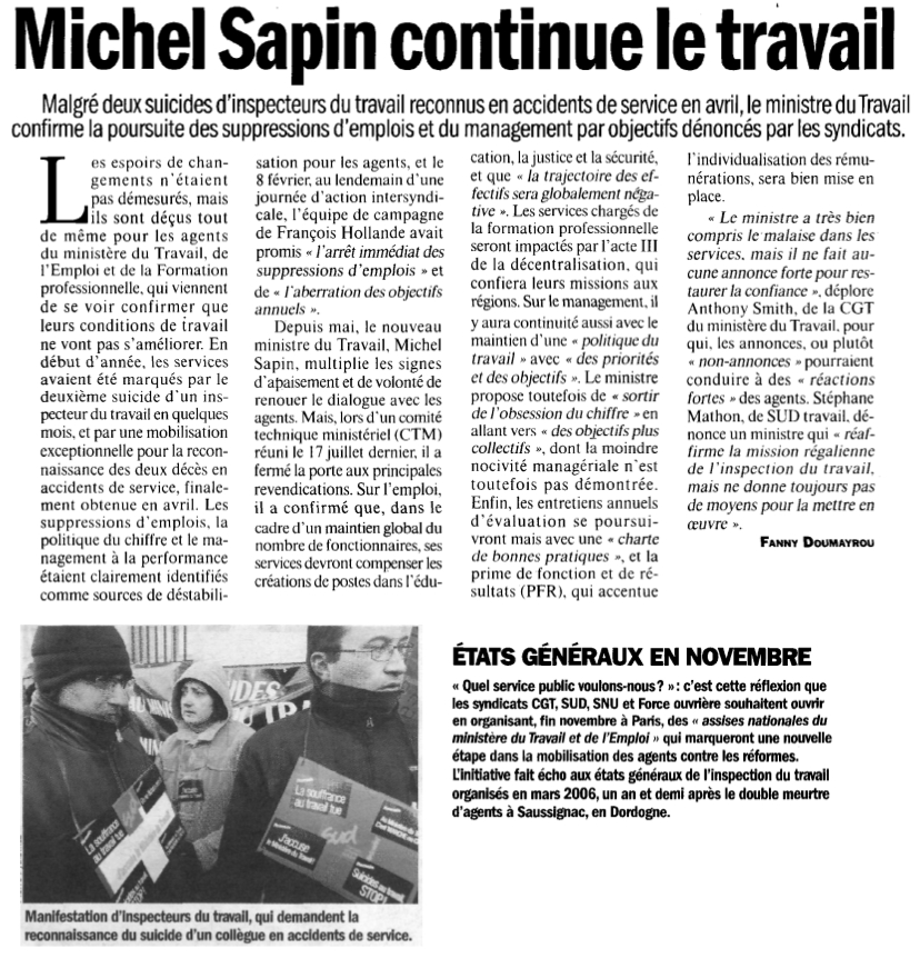 Catégories Articles de presse Michel Sapin continue le travail Auteur de l’article Par Laurent Date de l’article 2 août 2012 Aucun commentaire sur Michel Sapin continue le travail Ci-dessous l’article du journal l’Humanité paru le 02/08/2012 concernant les suites données par Michel Sapin aux problèmes identifiés suite aux suicides de nos deux collègues inspecteurs du travail. Étiquettes Suicides Romain Lecoustre - Luc Béal-Rainaldy