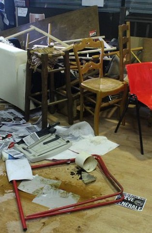 Les forces de l’ordre ont alors menacé de casser la vitrine. Elles ont fini par défoncer la porte au bélier, pénétrer dans le local, saccager une partie du matériel et procéder à une fouille en profondeur des lieux. Les militant-e-s présent-e-s ont gardé leur calme. Deux personnes ont été interpellées et sont actuellement retenues au commissariat central de Lille.le-local-cnt-de-lille-apres-intrusion-policiere-du-20-04-2016-reduc